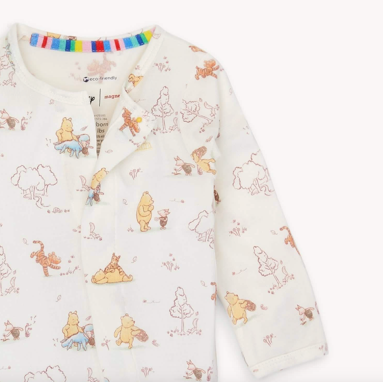 • Magnetic closures: magnets line the seam from the neck to upper thigh for sizes up to 0-3m & from neck to crotch for sizes 3-6m and up.