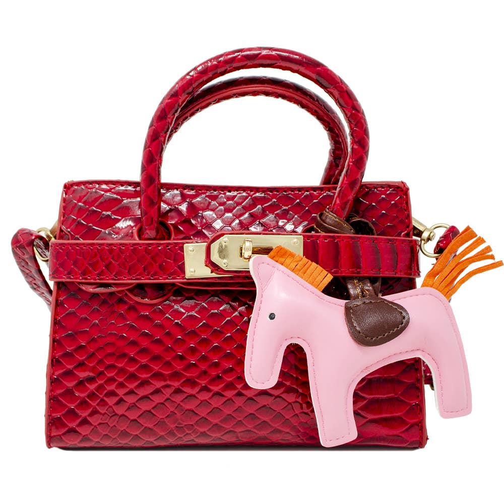 Elevate your child's style with our kids crocodile pony handbag featuring a chic crocodile textured print. This adorable accessory comes with a top handle and matching shoulder strap, providing versatile carrying options. The magnetic closure ensures easy access and security, while the stylish buckle on the front adds a touch of flair. Complete with a charming leather pony charm, this handbag is perfect for your little trendsetter's everyday adventures. Pony charm may vary in color.