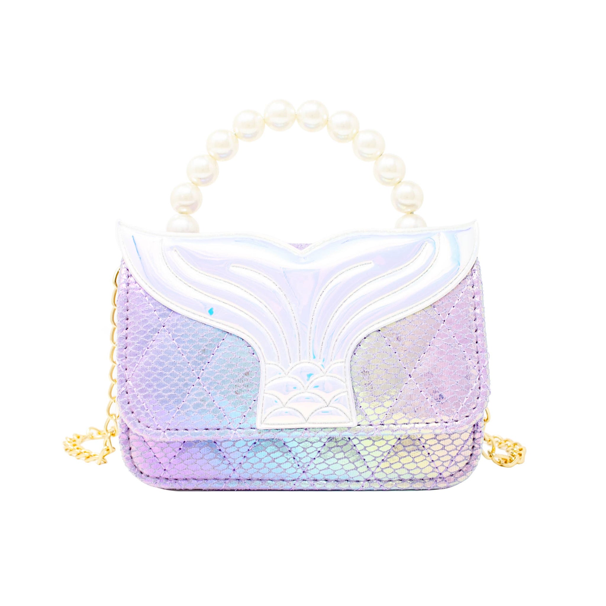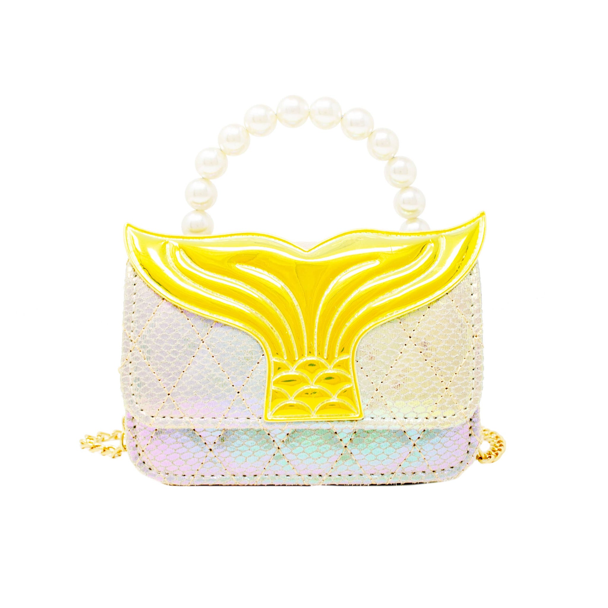 Our Enchanted Mermaid Handbag, designed for the little dreamer in your life. This captivating girls' handbag dazzles with a shiny glitter quilted finish, making every outing a sparkling occasion. The elegant pearl handle adds a touch of sophistication, while the versatile chain allows it to be worn comfortably over the shoulder or crossbody, adapting to any adventure. A magnetic flap closure keeps treasures secure, and the large mermaid fin charm on the flap ensures this bag stands out in a sea of style. Perfect for parties, playdates, or any magical moment, this handbag is sure to make a splash!
