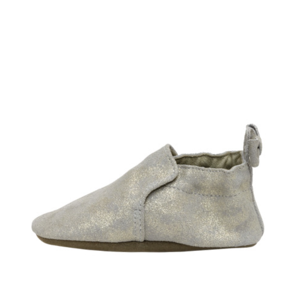 Robeez Pretty Pearl Soft Soles in Gold are comfortable baby slip-ons made with a premium suede upper in sparkly gold and a neutral brown suede on the sole. A shiny, metallic gold leather strip runs up and down the heel with a matching stand-up bow. A roomy fit and flexible material allow your baby's feet to flex naturally and grow up strong. These soft bottom baby girl shoes are carefully designed with the best materials and craftsmanship for your baby’s health, comfort, and safety.