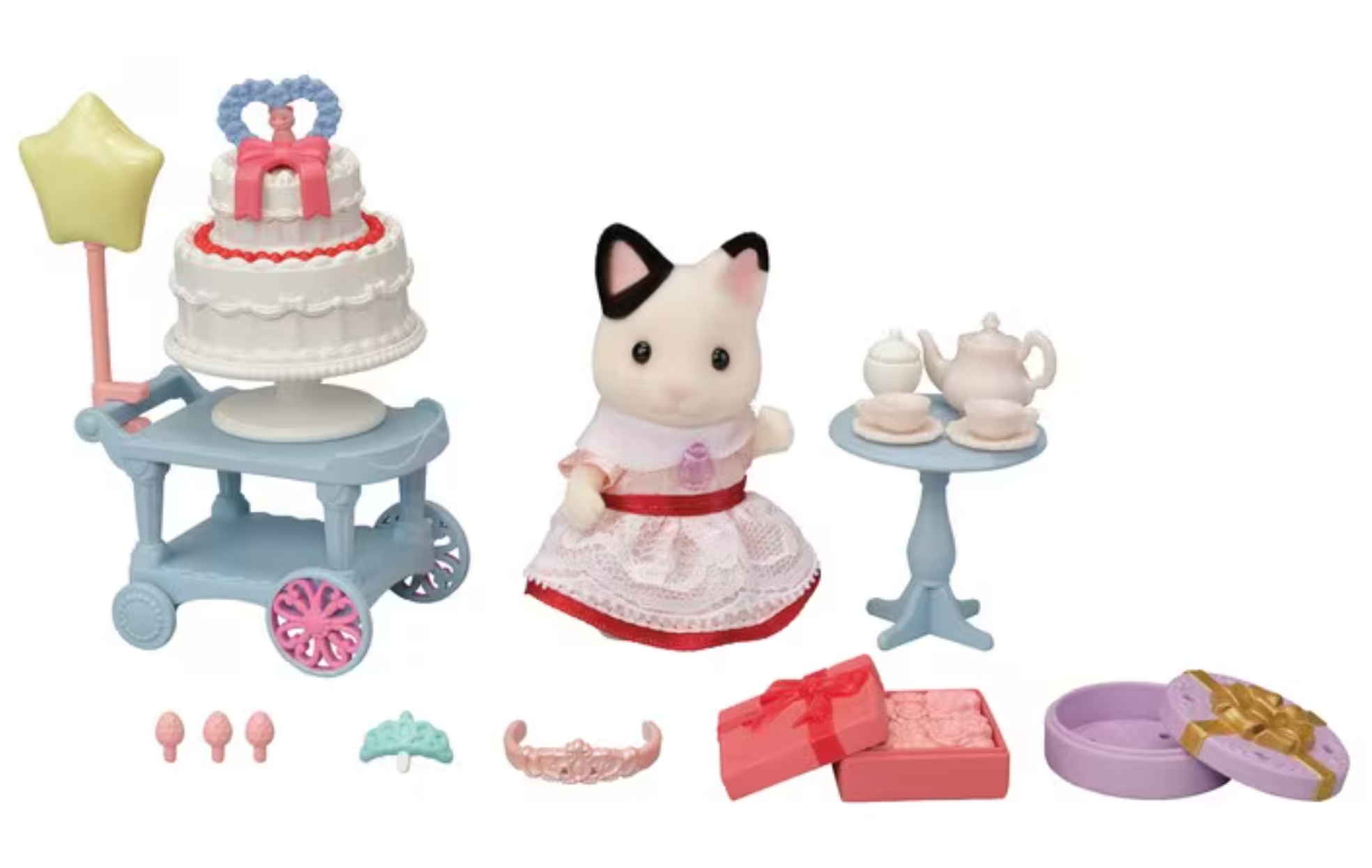 The Party Time Playset -Tuxedo Cat Girl- features Tuxedo Cat girl Lily in an exclusive party dress, plus a lavish two-tier cake and presents.