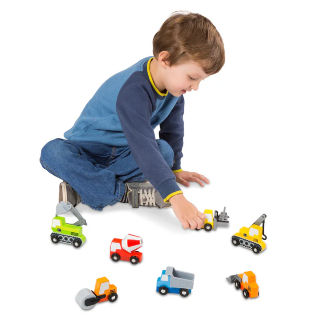 It's time to get constructive fun rolling with these sturdy wooden vehicles! The eight-piece set includes a steam roller, cement mixer, forklift, dump truck, front loader, crane, and backhoe, each approximately four inches long, and a construction piece to lift and load. All are brightly colored with lots of moving parts that are fun for kids three and older to grasp and maneuver. Designed to play perfectly with Melissa & Doug Activity Rugs, the construction vehicles store conveniently or can be displayed in the compartmentalized wooden tray.