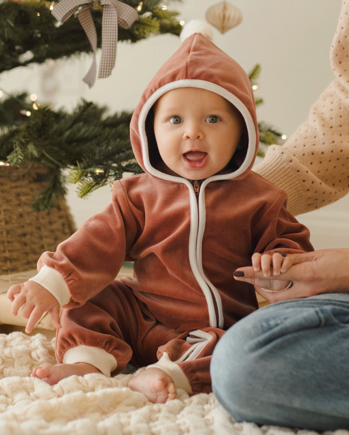 Long sleeve hooded fleece jumpsuit with ribbed sleeve and leg openings, a zipper down the front, and a hoodie with a pom pom on top.
