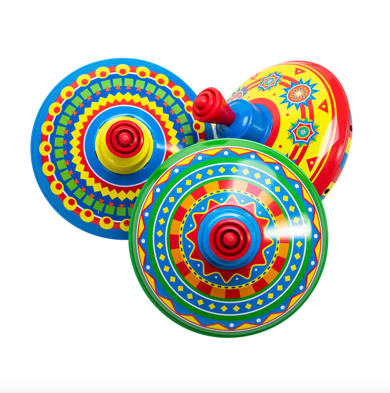 Spin the top and listen to them hum! These colorful tin tops are fun for everyone!