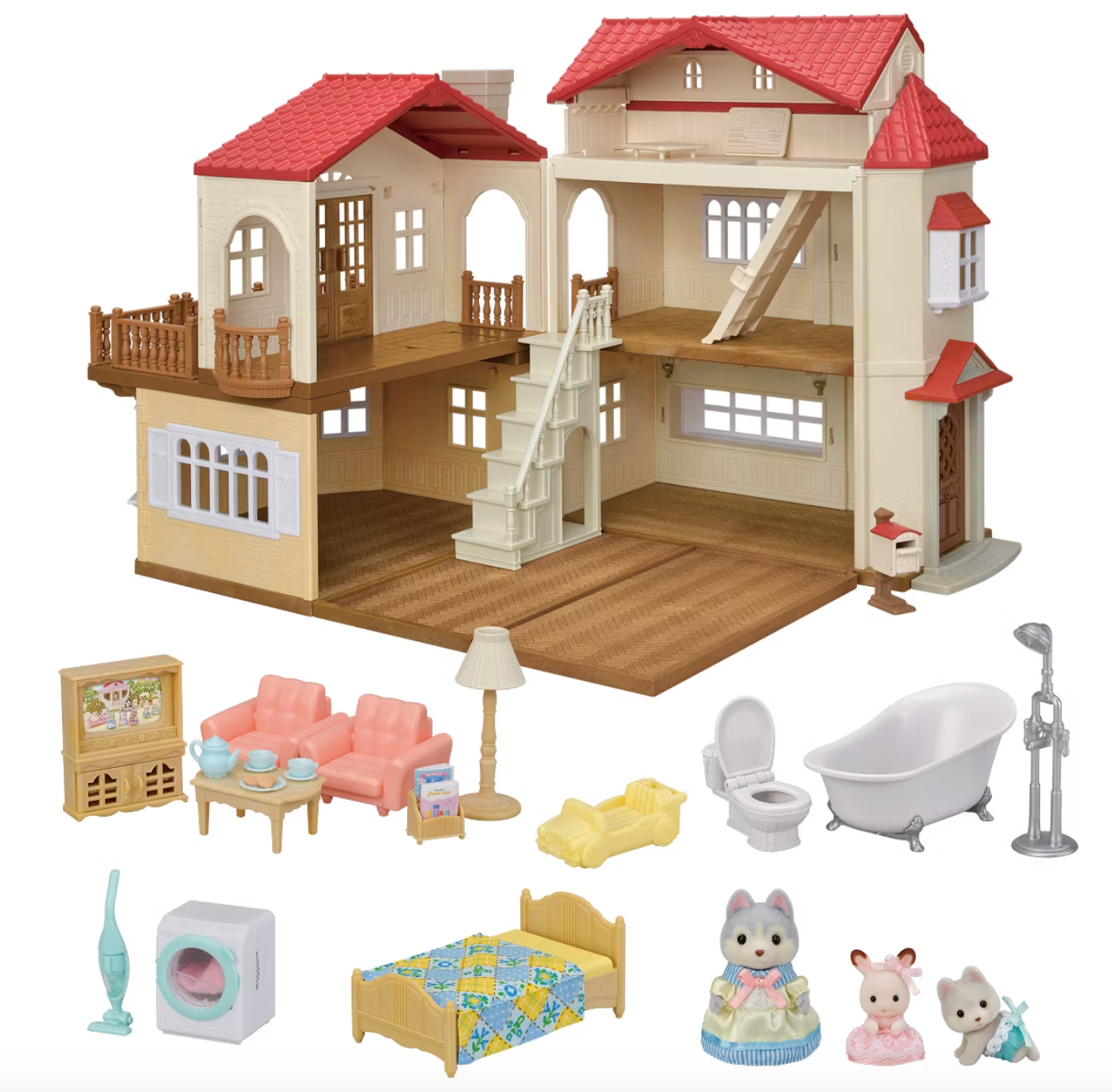 Red Roof Country Home Gift Set includes decorative furniture and accessories and 3 Calico Critter figures. The home can be opened for play at 90-degrees, 180-degrees, and any angle in-between. Home also closes for more play options and easy storage. Home lights up 3 lamps included. A second floor room and the roof piece are removable. Stack the rooms to create 3 levels. Set includes Husky Mother Avril, Husky Baby Linnea and Chocolate Rabbit Baby Creme. Red Roof Country Home connects to Red Roof Cozy Cottage (sold separately) to create a Grand Mansion. ...